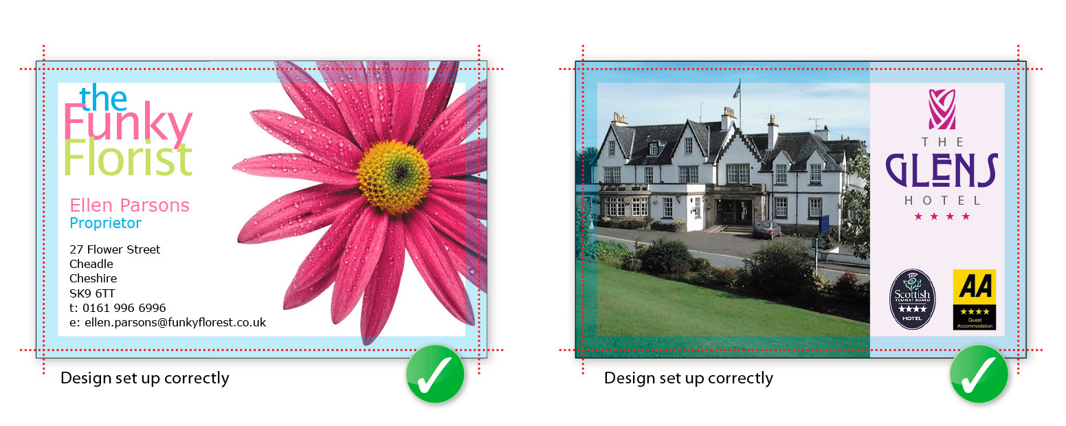 Please don’t use colours above 300% – you’re putting a lot of ink on to the page, and our quick turnaround may mean that your job doesn’t have time to dry before it is cut. Please ask for advice if you are unsure about ink levels.