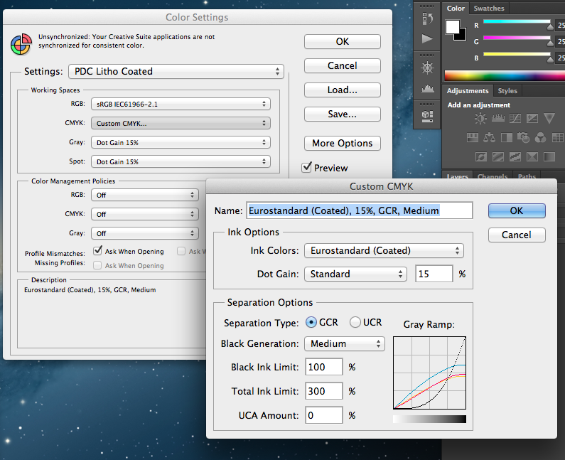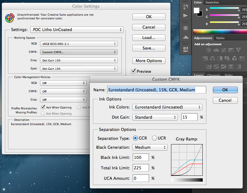 To create these presets in Photoshop, select Edit > Colour Settings > CMYK > Custom CMYK and then copy the screenshots below, then saving each preset for future use (e.g. one for Coated, and one for  UnCoated).