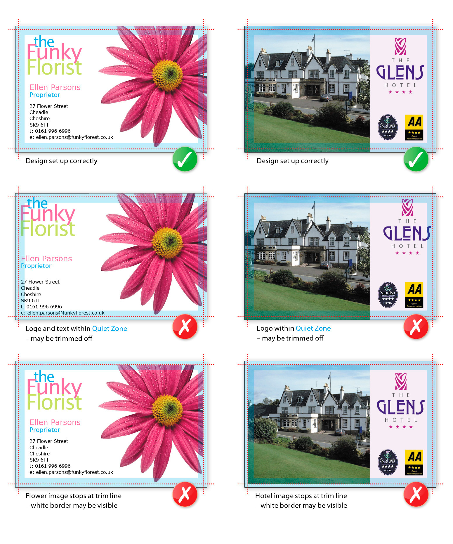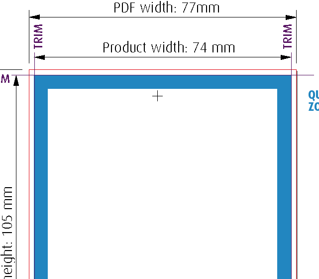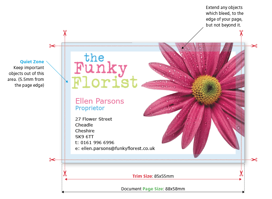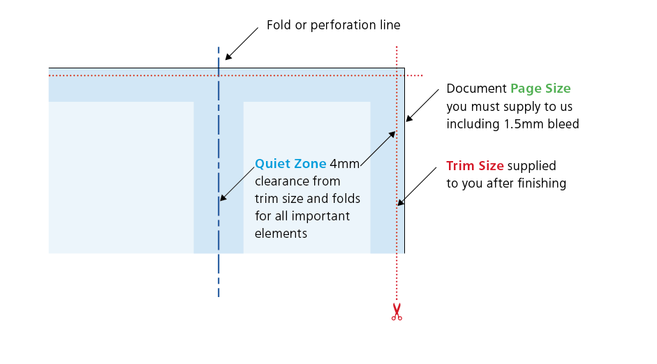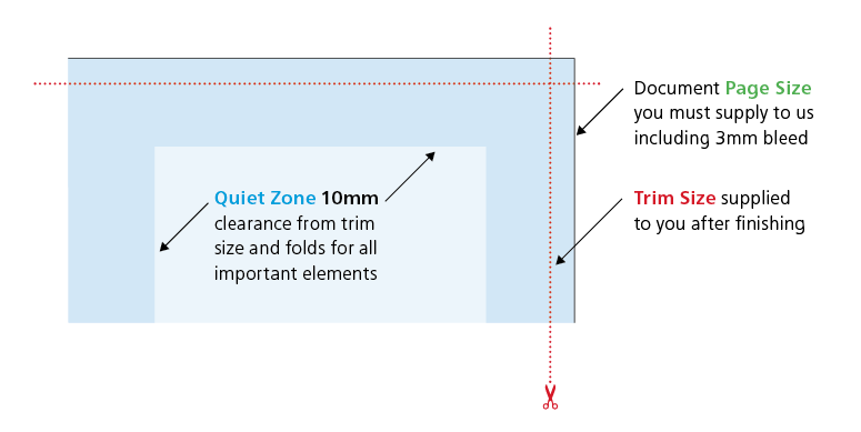 The quiet or safe zone may vary depending on the product ordered, you’ll need to check that you don’t have any important elements in this area. For most of our products we ask that all important elements are 4mm away from the cut edge, or 5.5mm away from the page edge. Elements within this area may appear closer to the edge than expected when guillotined and often result in an uneven looking design.