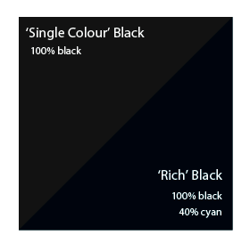 The alternative is rich black, which consists of 100% black and 40% cyan. A rich black should be used on larger areas to ensure an even, dark coverage, as the second ink colour disguises any inconsistencies. However, rich black should never be used on small text as any tiny deviance in registration will lead to a blurred effect.